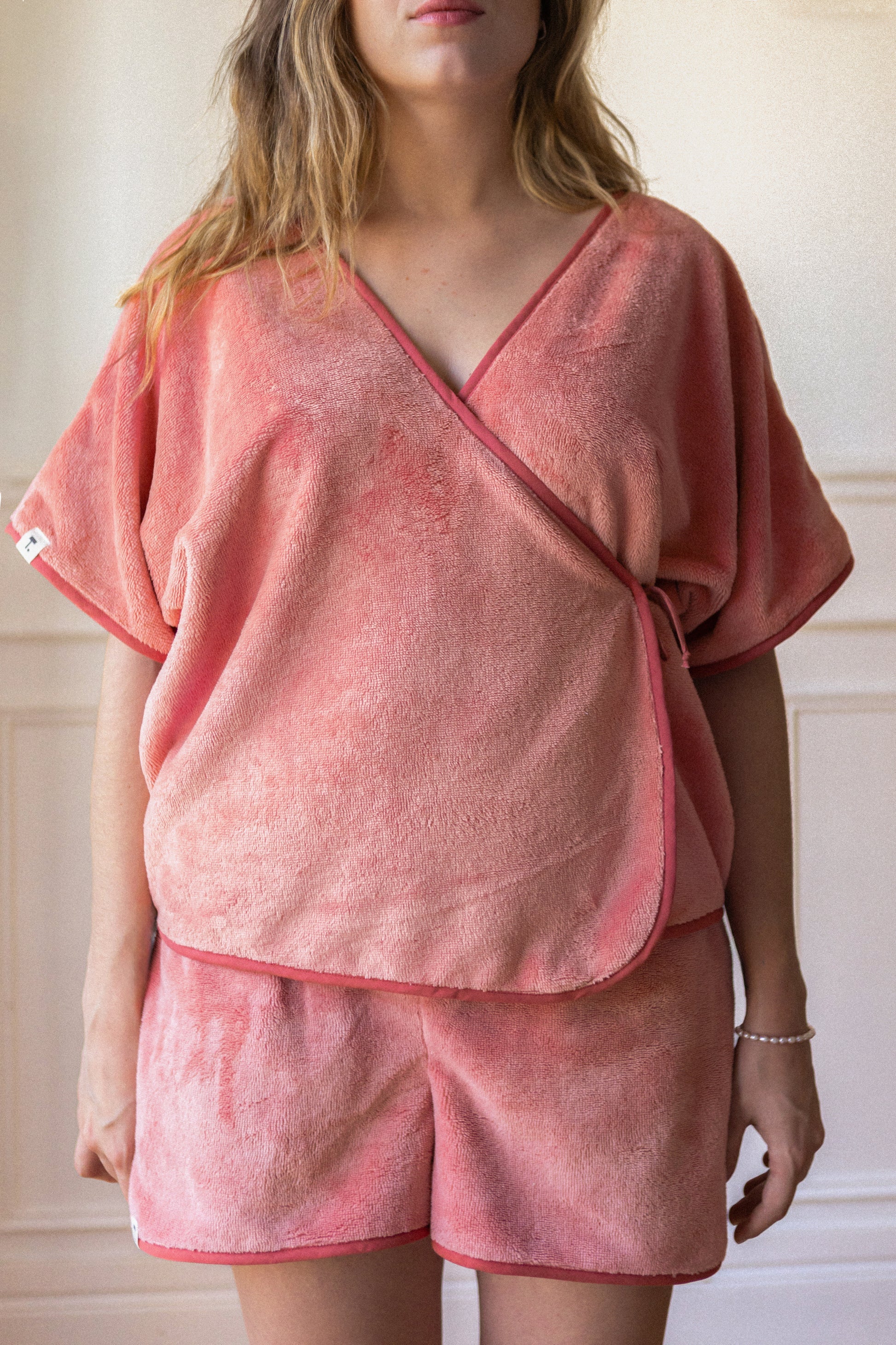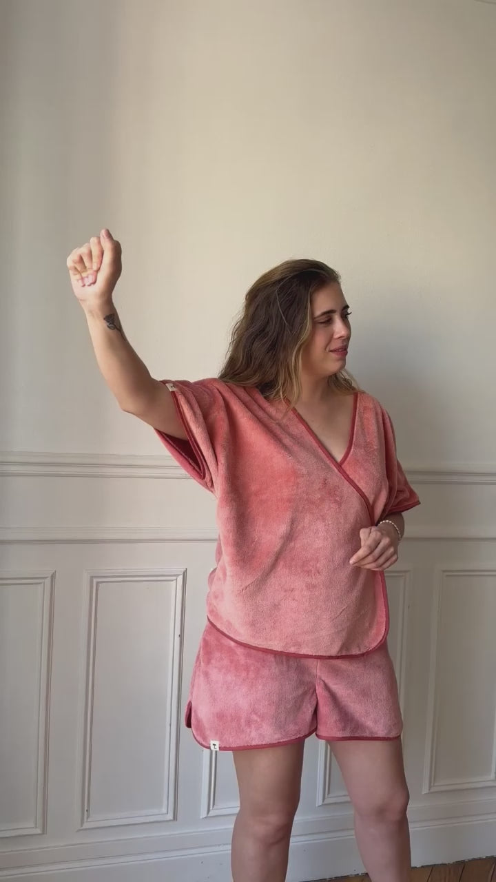 Découvrez l'Ensemble Cosy, une parfaite harmonie entre le Top Dorie et le Shorty Pauline, conçu pour celles qui recherchent à la fois confort et raffinement. Optez pour des pièces légèrement oversizes et féminines.